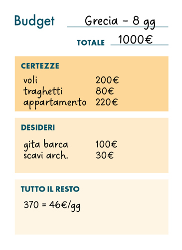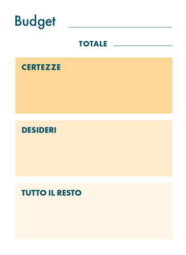 A questo punto prendi la calcolatrice e dal gran totale in alto sottrai le certezze e i desideri. Il numero che resta puoi segnarlo nel rettangolo tutto il resto. Per tutto il resto intendiamo quelle spese che non puoi pianificare o che non hai voglia di pianificare e che quindi sceglierai di fare di giorno in giorno: i pasti, le avventure impreviste e anche quell’oggettino di artigianato di cui ti innamorerai. Attenzione, perché in tutto il resto non rientrano cose superflue, ma cose che non puoi prevedere nel dettaglio. Se sai con certezza che vuoi andare a cena in un ristorante stellato, questa spesa non va qui, ma va nei desideri, cioè cose che vorresti fare e di cui puoi sapere più o meno l’importo.